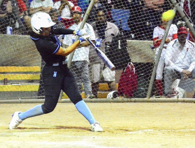 Norco’s Angelina Gonzales launches her second home run of the game against Fullerton in the Michelle Carew Tournament championship game. Gonzales led the Cougars to a 7 – 0 victory that avenged an earlier loss to the RedHawks in an Arizona tourney. Photo by Gary Evans