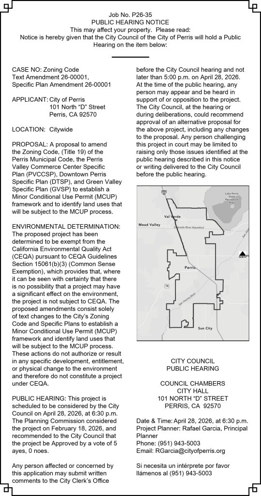 TSG No.: 92652550 TS No.: CA2500293549 APN: 320-530-019 Property Address: 2027 ESCONDIDO WAY PERRIS, CA 92571-7765 NOTICE OF TRUSTEE’S SALE YOU ARE IN DEFAULT UNDER A DEED OF TRUST, DATED 07/14/2021. UNLESS YOU TAKE ACTION TO PROTECT YOUR PROPERTY, IT MAY BE SOLD AT A PUBLIC SALE. IF YOU NEED AN EXPLANATION OF THE NATURE OF THE PROCEEDING AGAINST YOU, YOU SHOULD CONTACT A LAWYER. On 04/29/2026 at 09:00 A.M., First American Title Insurance Company, as duly appointed Trustee under and pursuant to Deed of Trust recorded 07/23/2021, as Instrument No. 2021-0442725, in book , page , , of Official Records in the office of the County Recorder of RIVERSIDE County, State of California. Executed by: RAYMOND PEREZ AND MARINA C PEREZ, HUSBAND AND WIFE AS JOINT TENANTS, WILL SELL AT PUBLIC AUCTION TO HIGHEST BIDDER FOR CASH, CASHIER’S CHECK/CASH EQUIVALENT or other form of payment authorized by 2924h(b), (Payable at time of sale in lawful money of the United States) In the courtyard, of the Historic Corona Civic Center 815 W Sixth St, Corona, CA 92882 All right, title and interest conveyed to and now held by it under said Deed of Trust in the property situated in said County and State described as: AS MORE FULLY DESCRIBED IN THE ABOVE MENTIONED DEED OF TRUST APN# 320-530-019 The street address and other common designation, if any, of the real property described above is purported to be: 2027 ESCONDIDO WAY, PERRIS, CA 92571-7765 The undersigned Trustee disclaims any liability for any incorrectness of the street address and other common designation, if any, shown herein. Said sale will be made, but without covenant or warranty, expressed or implied, regarding title, possession, or encumbrances, to pay the remaining principal sum of the note(s) secured by said Deed of Trust, with interest thereon, as provided in said note(s), advances, under the terms of said Deed of Trust, fees, charges and expenses of the Trustee and of the trusts created by said Deed of Trust. The total amount of the unpaid balance of the obligation secured by the property to be sold and reasonable estimated costs, expenses and advances at the time of the initial publication of the Notice of Sale is $ 453,585.21. The beneficiary under said Deed of Trust has deposited all documents evidencing the obligations secured by the Deed of Trust and has declared all sums secured thereby immediately due and payable, and has caused a written Notice of Default and Election to Sell to be executed. The undersigned caused said Notice of Default and Election to Sell to be recorded in the County where the real property is located. NOTICE TO POTENTIAL BIDDERS: If you are considering bidding on this property lien, you should understand that there are risks involved in bidding at a trustee auction. You will be bidding on a lien, not on the property itself. Placing the highest bid at a trustee auction does not automatically entitle you to free and clear ownership of the property. You should also be aware that the lien being auctioned off may be a junior lien. If you are the highest bidder at the auction, you are or may be responsible for paying off all liens senior to the lien being auctioned off, before you can receive clear title to the property. You are encouraged to investigate the existence, priority, and size of outstanding liens that may exist on this property by contacting the county recorder’s office or a title insurance company, either of which may charge you a fee for this information. If you consult either of these resources, you should be aware that the same lender may hold more than one mortgage or deed of trust on the property. Please be advised that the trustee may require entity or trust bidders at this trustee’s sale to provide information, documentation and/or certification of the vesting instructions and the data required to be reported pursuant to FinCEN regulations effective for transfers of residential real property to covered transferees on or after March 1, 2026. The required information must be provided to the trustee before a trustee’s deed upon sale will be issued for covered transfers. Additional information regarding these regulations and the required transferee information and certifications can be found at https://www.federalregister.gov/documents/2024/08/29/2024-19198/antimoneylaunderingregulationsforresidentialrealestate- transfers and https://www.fincen.gov/rrefaqs#D5. NOTICE TO PROPERTY OWNER: The sale date shown on this notice of sale may be postponed one or more times by the mortgagee, beneficiary, trustee, or a court, pursuant to Section 2924g of the California Civil Code. The law requires that information about trustee sale postponements be made available to you and to the public, as a courtesy to those not present at the sale. If you wish to learn whether your sale date has been postponed, and if applicable, the rescheduled time and date for the sale of this property, you may call 800-280-2832 or visit this internet website www.Auction.com, using the file number assigned to this case CA2500293549 Information about postponements that are very short in duration or that occur close in time to the scheduled sale may not immediately be reflected in the telephone information or on the Internet Website. The best way to verify postponement information is to attend the scheduled sale. NOTICE TO TENANT: You may have a right to purchase this property after the trustee auction if conducted after January 1, 2021, pursuant to Section 2924m of the California Civil Code. If you are an “eligible tenant buyer,” you can purchase the property if you match the last and highest bid placed at the trustee auction. If you are an “eligible bidder,” you may be able to purchase the property if you exceed the last and highest bid placed at the trustee auction. There are three steps to exercising this right of purchase. First, 48 hours after the date of the trustee sale, you can call 855-976-3916, or visit this internet website