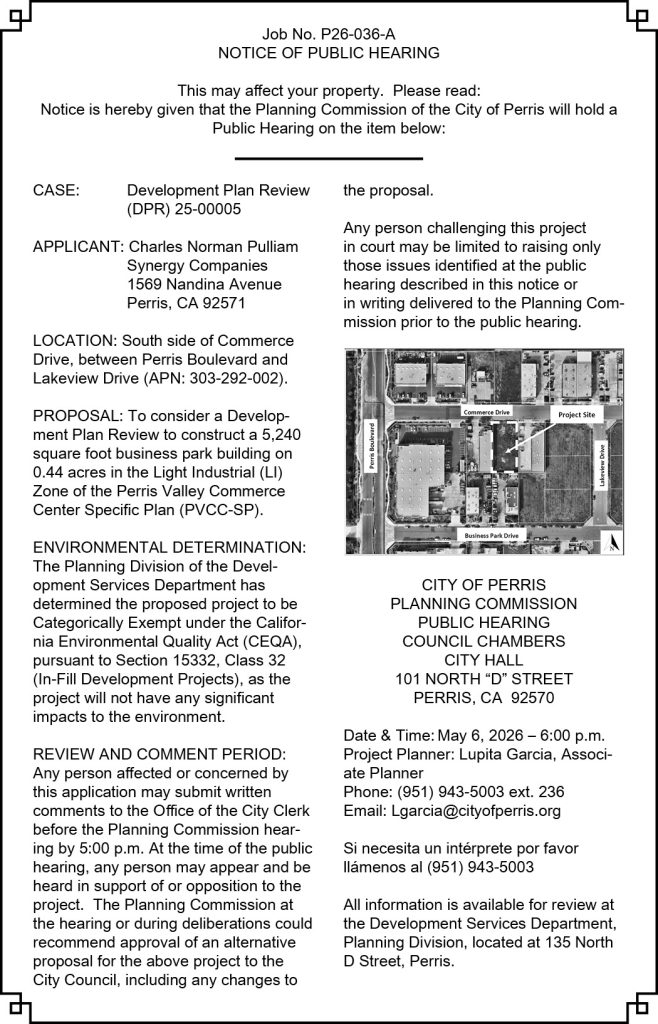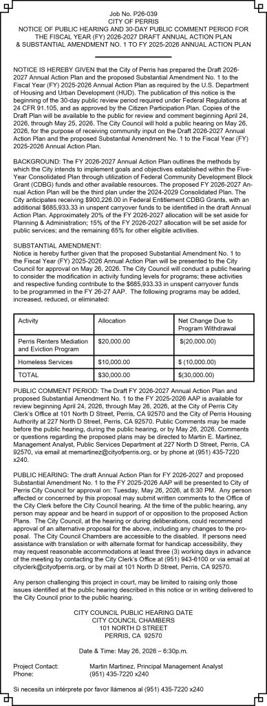 NOTICE OF TRUSTEE’S SALE T.S. No. 25-03507-GMCA Title No. 250686068-CAVOI APN. 308-354-008 YOU ARE IN DEFAULT UNDER A DEED OF TRUST DATED 08/10/2021. UNLESS YOU TAKE ACTION TO PROTECT YOUR PROPERTY, IT MAY BE SOLD AT A PUBLIC SALE. IF YOU NEED AN EXPLANATION OF THE NATURE OF THE PROCEEDING AGAINST YOU, YOU SHOULD CONTACT A LAWYER. A public auction sale to the highest bidder for cash, cashier’s check(s) drawn on a state or national bank must be made payable to National Default Servicing Corporation, a check drawn by a state or federal credit union, or a check drawn by a state or federal savings and loan association, savings association, or savings bank specified in Section 5102 of the Financial Code and authorized to do business in this state; will be held by the duly appointed trustee as shown below, of all right, title, and interest conveyed to and now held by the trustee in the hereinafter described property under and pursuant to a Deed of Trust described below. The sale will be made in an “as is” condition, but without covenant or warranty, expressed or implied, regarding title, possession, or encumbrances, to pay the remaining principal sum of the note(s) secured by the Deed of Trust, with interest and late charges thereon, as provided in the note(s), advances, under the terms of the Deed of Trust, interest thereon, fees, charges and expenses of the Trustee for the total amount (at the time of the initial publication of the Notice of Sale) reasonably estimated to be set forth below. The amount may be greater on the day of sale. Trustor: Erick A Beltran, a single man and Imelda Palma Contreras, an unmarried woman, as joint tenants Duly Appointed Trustee: National Default Servicing Corporation Recorded 08/13/2021 as Instrument No. 2021-0487286 (or Book, Page) of the Official Records of Riverside County, California. Date of Sale: : 06/24/2026 at 9:00 AM Place of Sale: In the courtyard, of the Historic Corona Civic Center of the 815 W Sixth St, Corona, CA 92882 Estimated amount of unpaid balance and other charges: $463,276.75 Street Address or other common designation of real property: 2067 Mount Verdugo Lane, Perris, CA 92571 A.P.N.: 308-354-008 The undersigned Trustee disclaims any liability for any incorrectness of the street address or other common designation, if any, shown above. If no street address or other common designation is shown, directions to the location of the property may be obtained by sending a written request to the beneficiary within 10 days of the date of first publication of this Notice of Sale. If the Trustee is unable to convey title for any reason, the successful bidder’s sole and exclusive remedy shall be the return of monies paid to the Trustee, and the successful bidder shall have no further recourse. The requirements of California Civil Code Section 2923.5(b)/2923.55(c) were fulfilled when the Notice of Default was recorded. NOTICE TO POTENTIAL BIDDERS: If you are considering bidding on this property lien, you should understand that there are risks involved in bidding at a trustee auction. You will be bidding on a lien, not on the property itself. Placing the highest bid at a trustee auction does not automatically entitle you to free and clear ownership of the property. You should also be aware that the lien being auctioned off may be a junior lien. If you are the highest bidder at the auction, you are or may be responsible for paying off all liens senior to the lien being auctioned off, before you can receive clear title to the property. You are encouraged to investigate the existence, priority, and size of outstanding liens that may exist on this property by contacting the county recorder’s office or a title insurance company, either of which may charge you a fee for this information. If you consult either of these resources, you should be aware that the same lender may hold more than one mortgage or deed of trust on the property. NOTICE TO PROPERTY OWNER: The sale date shown on this notice of sale may be postponed one or more times by the mortgagee, beneficiary, trustee, or a court, pursuant to Section 2924g of the California Civil Code. The law requires that information about trustee sale postponements be made available to you and to the public, as a courtesy to those not present at the sale. If you wish to learn whether your sale date has been postponed, and, if applicable, the rescheduled time and date for the sale of this property, you may call 800-280-2832 or visit this internet website www.ndscorp.com/sales, using the file number assigned to this case 25-03507-GMCA. Information about postponements that are very short in duration or that occur close in time to the scheduled sale may not immediately be reflected in the telephone information or on the internet website. The best way to verify postponement information is to attend the scheduled sale. NOTICE TO TENANT*: You may have a right to purchase this property after the trustee auction pursuant to Section 2924m of the California Civil Code. If you are a “representative of all eligible tenant buyers” you may be able to purchase the property if you match the last and highest bid placed at the trustee auction. If you are an “eligible bidder,” you may be able to purchase the property if you exceed the last and highest bid placed at the trustee auction. There are three steps to exercising this right of purchase. First, 48 hours after the date of the trustee sale, you can call 888-264-4010, or visit this internet website www.ndscorp.com, using the file number assigned to this case 25-03507-GMCA to find the date on which the trustee’s sale was held, the amount of the last and highest bid, and the address of the trustee. Second, you must send a written notice of intent to place a bid so that the trustee receives it no more than 15 days after the trustee’s sale. Third, you must submit a bid so that the trustee receives it no more than 45 days after the trustee’s sale. If you think 
