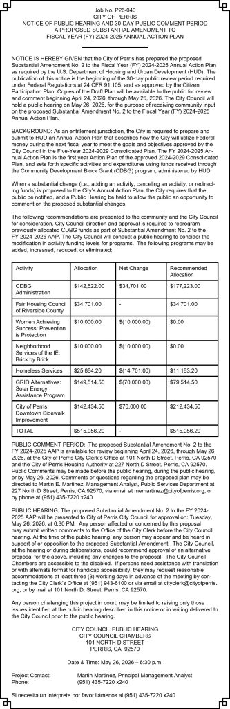 The CITY OF PERRIS invites online bids via PlanetBids, until 2:00 PM (PST), on May 5, 2026, for the Downtown Sidewalk Improvement Project. The project involves ADA upgrades and sidewalk repairs on 6th Street between G and F Streets, including 704 sq. ft. of ADA ramps, 3 driveway approaches, 3,484.34 sq. ft. of sidewalk replacement.