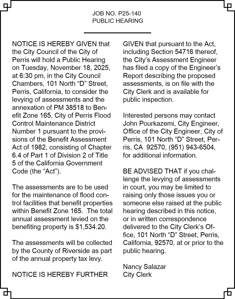 NOTICE OF TRUSTEE’S SALE TS No. CA-24-1003596-SH Order No.: 2565538CAD YOU ARE IN DEFAULT UNDER A DEED OF TRUST DATED 3/16/2007. UNLESS YOU TAKE ACTION TO PROTECT YOUR PROPERTY, IT MAY BE SOLD AT A PUBLIC SALE. IF YOU NEED AN EXPLANATION OF THE NATURE OF THE PROCEEDING AGAINST YOU, YOU SHOULD CONTACT A LAWYER. A public auction sale to the highest bidder for cash, or cash equivalent if deemed acceptable to the trustee, cashier’s check drawn on a state or national bank, check drawn by state or federal credit union, or a check drawn by a state or federal savings and loan association, or savings association, or savings bank specified in Section 5102 to the Financial Code and authorized to do business in this state, will be held by duly appointed trustee. The sale will be made, but without covenant or warranty, expressed or implied, regarding title, possession, or encumbrances, to pay the remaining principal sum of the note(s) secured by the Deed of Trust, with interest and late charges thereon, as provided in the note(s), advances, under the terms of the Deed of Trust, interest thereon, fees, charges and expenses of the Trustee for the total amount (at the time of the initial publication of the Notice of Sale) reasonably estimated to be set forth below. The amount may be greater on the day of sale. BENEFICIARY MAY ELECT TO BID LESS THAN THE TOTAL AMOUNT DUE. Trustor(s): SASSAN HEMMATI, AND CARRIE C. HEMMATI, HUSBAND AND WIFE AS JOINT TENANTS Recorded: 3/30/2007 as Instrument No. 2007-0218236 of Official Records in the office of the Recorder of RIVERSIDE County, California; Date of Sale: 11/4/2025 at 09:00 AM Place of Sale: In the courtyard, of the Historic Corona Civic Center, 815 W Sixth St, Corona, CA 92882 Amount of unpaid balance and other charges: $312,551.70 The purported property address is: 203 ALABASTER LOOP, PERRIS, CA 92570 Assessor’s Parcel No. : 330-371-011 All bidders, at the date, time, and place of the scheduled sale, will be required to show satisfactory support to the auctioneer of their ability to pay the amount they intend to bid, unless arrangements have been made with the trustee prior to the scheduled sale. NOTICE TO POTENTIAL BIDDERS: If you are considering bidding on this property lien, you should understand that there are risks involved in bidding at a trustee auction. You will be bidding on a lien, not on the property itself. Placing the highest bid at a trustee auction does not automatically entitle you to free and clear ownership of the property. You should also be aware that the lien being auctioned off may be a junior lien. If you are the highest bidder at the auction, you are or may be responsible for paying off all liens senior to the lien being auctioned off, before you can receive clear title to the property. You are encouraged to investigate the existence, priority, and size of outstanding liens that may exist on this property by contacting the county recorder’s office or a title insurance company, either of which may charge you a fee for this information. If you consult either of these resources, you should be aware that the same lender may hold more than one mortgage or deed of trust on the property. NOTICE TO PROPERTY OWNER: The sale date shown on this notice of sale may be postponed one or more times by the mortgagee, beneficiary, trustee, or a court, pursuant to Section 2924g of the California Civil Code. The law requires that information about trustee sale postponements be made available to you and to the public, as a courtesy to those not present at the sale. If you wish to learn whether your sale date has been postponed, and, if applicable, the rescheduled time and date for the sale of this property, you may call 916-939-0772 for information regarding the trustee’s sale or visit this internet website http://www.qualityloan.com, using the file number assigned to this foreclosure by the Trustee: CA-24-1003596-SH. Information about postponements that are very short in duration or that occur close in time to the scheduled sale may not immediately be reflected in the telephone information or on the internet website. The best way to verify postponement information is to attend the scheduled sale. NOTICE TO TENANT: You may have a right to purchase this property after the trustee auction pursuant to Section 2924m of the California Civil Code. If you are an “eligible tenant buyer,” you can purchase the property if you match the last and highest bid placed at the trustee auction. If you are an “eligible bidder,” you may be able to purchase the property if you exceed the last and highest bid placed at the trustee auction. There are three steps to exercising this right of purchase. First, 48 hours after the date of the trustee sale, you can call 619-645-7711, or visit this internet website http://www.qualityloan.com, using the file number assigned to this foreclosure by the Trustee: CA-24-1003596-SH to find the date on which the trustee’s sale was held, the amount of the last and highest bid, and the address of the trustee. Second, you must send a written notice of intent to place a bid so that the trustee receives it no more than 15 days after the trustee’s sale. Third, you must submit a bid so that the trustee receives it no more than 45 days after the trustee’s sale. If you think you may qualify as an “eligible tenant buyer” or “eligible bidder,” you should consider contacting an attorney or appropriate real estate professional immediately for advice regarding this potential right to purchase. NOTICE TO PROSPECTIVE OWNEROCCUPANT: Any prospective owneroccupant as defined in Section 2924m of the California Civil Code who is the last and highest bidder at the trustee’s sale shall provide the required affidavit or declaration of eligibility to the auctioneer at the trustee’s sale or shall have it delivered to QUALITY LOAN SERVICE CORPORATION by 5 p.m. on the next business day following the trustee’s sale at the address set 