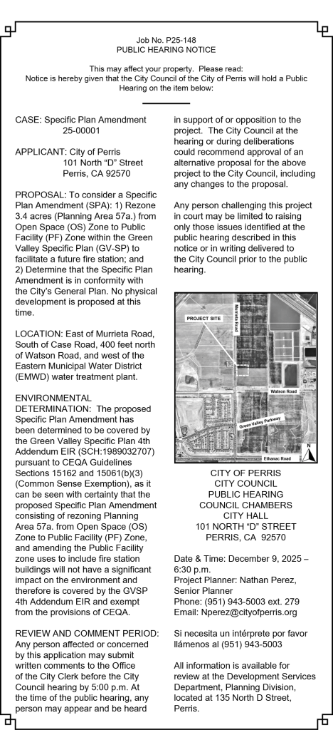 NOTICE OF TRUSTEE”S SALE Trustee’s Sale No. CARCS-25021206 YOU ARE IN DEFAULT UNDER A DEED OF TRUST DATED 2/12/2021. UNLESS YOU TAKE ACTION TO PROTECT YOUR PROPERTY, IT MAY BE SOLD AT A PUBLIC SALE. IF YOU NEED AN EXPLANATION OF THE NATURE OF THE PROCEEDING AGAINST YOU, YOU SHOULD CONTACT A LAWYER. NOTICE TO PROPERTY OWNER: The sale date shown on this notice of sale may be postponed one or more times by the mortgagee, beneficiary, trustee, or a court, pursuant to Section 2924g of the California Civil Code. The law requires that information about trustee sale postponements be made available to you and to the public, as a courtesy to those not present at the sale. If you wish to learn whether your sale date has been postponed, and, if applicable, the rescheduled time and date for the sale of this property, you may call 1-866-539-4173 or visit this Internet Web site www.servicelinkauction.com, using the file number assigned to this case, CARCS-25021206. Information about postponements that are very short in duration or that occur close in time to the scheduled sale may not immediately be reflected in the telephone information or on the Internet Web site. The best way to verify postponement information is to attend the scheduled sale. On December 2, 2025, at 9:00:00 AM, AT THE HISTORIC CORONA CIVIC CENTER, 815 W. SIXTH STREET, in the City of CORONA, County of RIVERSIDE, State of CALIFORNIA, PEAK FORECLOSURE SERVICES, INC., a California corporation, as duly appointed Trustee under that certain Deed of Trust executed by THOMAS E HUDSON, A WIDOWER, as Trustors, recorded on 3/29/2021, as Instrument No. 2021-0194415, of Official Records in the office of the Recorder of RIVERSIDE County, State of CALIFORNIA, under the power of sale therein contained, WILL SELL AT PUBLIC AUCTION TO THE HIGHEST BIDDER, for cash, cashier’s check drawn on a state or national bank, check drawn by a state or federal credit union, or a check drawn by a state or federal savings and loan association, or savings association, or savings bank specified in Section 5102 of the Financial Code and authorized to do business in this state will be held by the duly appointed trustee as shown below, of all right, title, and interest conveyed to and now held by the trustee in the hereinafter described property under and pursuant to a Deed of Trust described below. The sale will be made, but without covenant or warranty, expressed or implied, regarding title, possession, or encumbrances, to pay the remaining principal sum of the note(s) secured by the Deed of Trust, with interest and late charges thereon, as provided in the note(s), advances, under the terms of the Deed of Trust, interest thereon, fees, charges and expenses of the Trustee for the total amount (at the time of the initial publication of the Notice of Sale) reasonably estimated to be set forth below. The amount may be greater on the day of sale. Property is being sold “as is — where is’. TAX PARCEL NO. 320-151-002 LOT 210 OF TRACT NO. 20211, IN THE CITY OF PERRIS, COUNTY OF RIVERSIDE, STATE OF CALIFORNIA, AS PER MAP RECORDED IN BOOK 210, PAGE(S) 1 THROUGH 8, INCLUSIVE OF MAPS, FILED IN THE OFFICE OF THE COUNTY RECORDER OF SAID COUNTY. EXCEPT THEREFROM ALL OIL, GAS, MINERALS, AND OTHER HYDROCARBON SUBSTANCES LYING BELOW THE SURFACE OF SAID LAND, BUT WITH NO RIGHT OF SURFACE ENTRY, AS PROVIDED IN DEEDS OF RECORD. From information which the Trustee deems reliable, but for which Trustee makes no representation or warranty, the street address or other common designation of the above described property is purported to be 2107 STAR THISTLE LN, PERRIS, CA 92571. Said property is being sold for the purpose of paying the obligations secured by said Deed of Trust, including fees and expenses of sale. The total amount of the unpaid principal balance, interest thereon, together with reasonably estimated costs, expenses and advances at the time of the initial publication of the Notice of Trustee’s Sale is $229,149.98. NOTICE TO POTENTIAL BIDDERS: If you are considering bidding on this property lien, you should understand that there are risks involved in bidding at a trustee auction. You will be bidding on a lien, not on the property itself. Placing the highest bid at a trustee auction does not automatically entitle you to free and clear ownership of the property. You should also be aware that the lien being auctioned off may be a junior lien. If you are the highest bidder at the auction, you are or may be responsible for paying off all liens senior to the lien being auctioned off, before you can receive clear title to the property. You are encouraged to investigate the existence, priority, and size of outstanding liens that may exist on this property by contacting the county recorder’s office or a title insurance company, either of which may charge you a fee for this information. If you consult either of these resources, you should be aware that the same lender may hold more than one mortgage or deed of trust on the property. NOTICE TO TENANT: You may have a right to purchase this property after the trustee auction pursuant to Section 2924m of the California Civil Code. If you are an “eligible tenant buyer,” you can purchase the property if you match the last and highest bid placed at the trustee auction. If you are an “eligible bidder,” you may be able to purchase the property if you exceed the last and highest bid placed at the trustee auction. There are three steps to exercising this right of purchase. First, 48 hours after the date of the trustee sale, you can call 877-237-7878, or visit www.peakforeclosure.com using file number assigned to this case: CARCS-25021206 to find the date on which the trustee’s sale was held, the amount of the last and highest bid, and the address of the trustee. Second, you must send a written notice of intent to place a bid so that the trustee receives it no more than 15 days after the trustee’s sale. Third, you must submit a