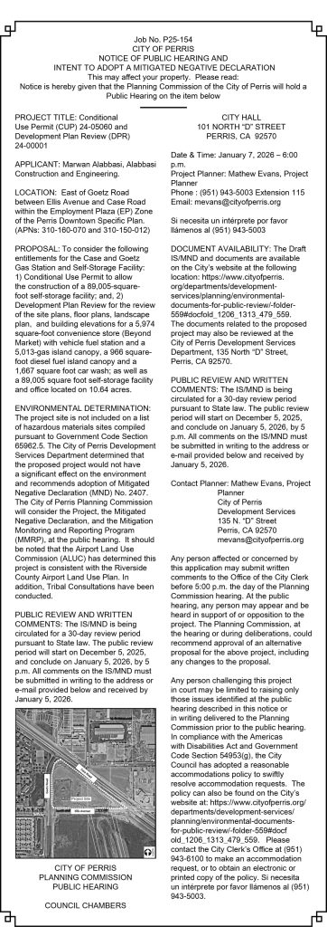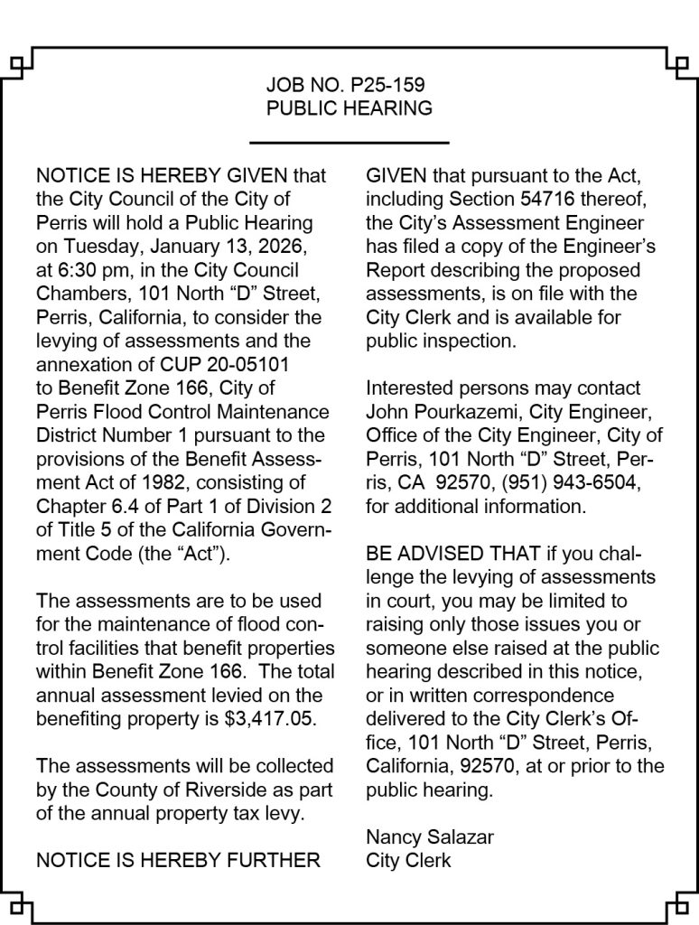 NOTICE IS HEREBY GIVEN that at 6:30 p.m. on January 13, 2026, or as soon thereafter as practicable, at City Hall, located at 101 North “D” Street, Perris, California 92570, the City Council of the City of Perris, California (the “City Council”) will hold a public hearing on the Annexation of territory (“Annexation No. 74”) to City of Perris Community Facilities District No. 2001-3 (North Perris Public Safety) (the "CFD"), the proposed rate, and method of apportionment of the special tax (the "Special Tax") to be levied on certain property within Annexation No. 74.
