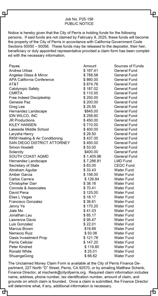 NOTICE OF TRUSTEE’S SALE T.S. No. 25-01945-GMCA Title No. 250405049-CAVOI APN. 311-323-001 YOU ARE IN DEFAULT UNDER A DEED OF TRUST DATED 07/19/2022. UNLESS YOU TAKE ACTION TO PROTECT YOUR PROPERTY, IT MAY BE SOLD AT A PUBLIC SALE, IF YOU NEED AN EXPLANATION OF THE NATURE OF THE PROCEEDING AGAINST YOU, YOU SHOULD CONTACT A LAWYER. A public auction sale to the highest bidder for cash, cashier’s check(s) drawn on a state or national bank must be made payable to National Default Servicing Corporation, a check drawn by a state or federal credit union, or a check drawn by a state or federal savings and loan association, savings association, or savings bank specified in Section 5102 of the Financial Code and authorized to do business in this state; will be held by the duly appointed trustee as shown below, of all right, title, and interest conveyed to and now held by the trustee in the hereinafter described property under and pursuant to a Deed of Trust described below. The sale will be made in an “as is” condition, but without covenant or warranty, expressed or implied, regarding title, possession, or encumbrances, to pay the remaining principal sum of the note(s) secured by the Deed of Trust, with interest and late charges thereon, as provided in the note(s), advances, under the terms of the Deed of Trust, interest thereon, fees, charges and expenses of the Trustee for the total amount (at the time of the initial publication of the Notice of Sale) reasonably estimated to be set forth below. The amount may be greater on the day of sale. Trustor: Lorraine Taylor and Robert A Jackson, wife and husband, as joint tenants Duly Appointed Trustee: National Default Servicing Corporation Recorded 07/20/2022 as Instrument No. 2022-0323459 (or Book, Page) of the Official Records of Riverside County, California. Date of Sale: : 01/21/2026 at 9:00 AM Place of Sale: in the courtyard, of the Historic Corona Civic Center, 815 W., Sixth Street, Corona CA 92882 Estimated amount of unpaid balance and other charges: $519,337.26 Street Address or other common designation of real property: 1491 Portrait Rd, Perris, CA 92571 A.P.N.: 311-323-001 The undersigned Trustee disclaims any liability for any incorrectness of the street address or other common designation, if any, shown above. If no street address or other common designation is shown, directions to the location of the property may be obtained by sending a written request to the beneficiary within 10 days of the date of first publication of this Notice of Sale. If the Trustee is unable to convey title for any reason, the successful bidder’s sole and exclusive remedy shall be the return of monies paid to the Trustee, and the successful bidder shall have no further recourse. The requirements of California Civil Code Section 2923.5(b)/2923.55(c) were fulfilled when the Notice of Default was recorded. NOTICE TO POTENTIAL BIDDERS: If you are considering bidding on this property lien, you should understand that there are risks involved in bidding at a trustee auction. You will be bidding on a lien, not on the property itself. Placing the highest bid at a trustee auction does not automatically entitle you to free and clear ownership of the property. You should also be aware that the lien being auctioned off may be a junior lien. If you are the highest bidder at the auction, you are or may be responsible for paying off all liens senior to the lien being auctioned off, before you can receive clear title to the property. You are encouraged to investigate the existence, priority, and size of outstanding liens that may exist on this property by contacting the county recorder’s office or a title insurance company, either of which may charge you a fee for this information. If you consult either of these resources, you should be aware that the same lender may hold more than one mortgage or deed of trust on the property. NOTICE TO PROPERTY OWNER: The sale date shown on this notice of sale may be postponed one or more times by the mortgagee, beneficiary, trustee, or a court, pursuant to Section 2924g of the California Civil Code. The law requires that information about trustee sale postponements be made available to you and to the public, as a courtesy to those not present at the sale. If you wish to learn whether your sale date has been postponed, and, if applicable, the rescheduled time and date for the sale of this property, you may call 800-280-2832 or visit this internet website www.ndscorp.com/sales, using the file number assigned to this case 25-01945-GMCA. Information about postponements that are very short in duration or that occur close in time to the scheduled sale may not immediately be reflected in the telephone information or on the internet website. The best way to verify postponement information is to attend the scheduled sale. NOTICE TO TENANT*: You may have a right to purchase this property after the trustee auction pursuant to Section 2924m of the California Civil Code. If you arc a “representative of all eligible tenant buyers” you may be able to purchase the property if you match the last and highest bid placed at the trustee auction. If you are an “eligible bidder,” you may be able to purchase the property if you exceed the last and highest bid placed at the trustee auction. There are three steps to exercising this right of purchase. First, 48 hours after the date of the trustee sale, you can call 888-264-4010, or visit this internet website www.ndscorp.com, using the file number assigned to this case 25-01945-GMCA to find the date on which the trustee’s sale was held, the amount of the last and highest bid, and the address of the trustee. Second, you must send a written notice of intent to place a bid so that the trustee receives it no more than 15 days after the trustee’s sale. Third, you must submit a bid so that the trustee receives it no more than 45 days after the trustee’s sale. If you think you may qualify as a “repres